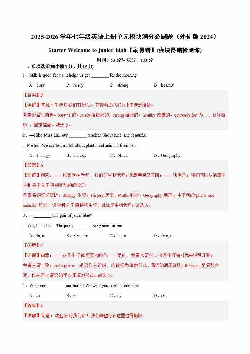 Starter(刷易错)(模块易错检测练)(教师版)单元模块满分必刷题(外研版2024)