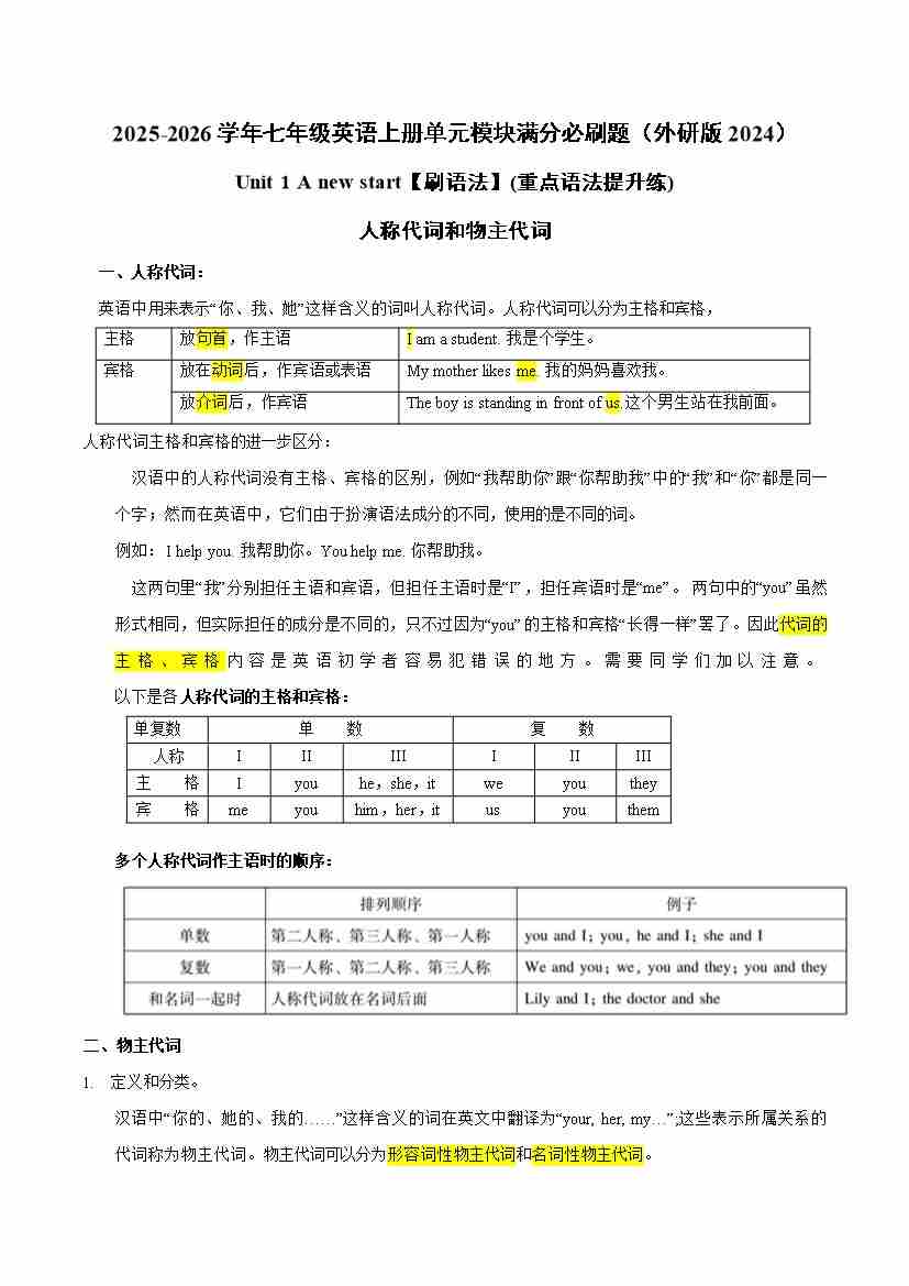 Unit 1(刷语法)人称代词和物主代词(重点语法提升练)(学生版)单元模块满分必刷题(外研版2024)