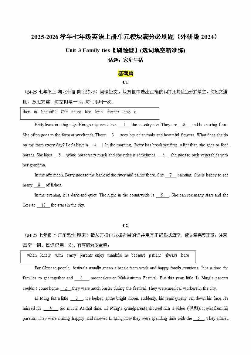 Unit 3(刷题型)(选词填空精准练)(原卷版)单元模块满分必刷题(外研版2024)