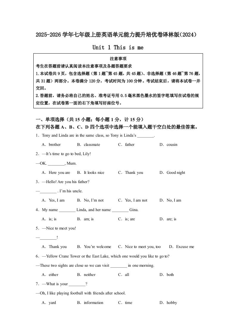 (单元培优卷)Unit 1 This is me 单元能力提升培优卷(含答案解析)-2025 - 2026学年七年级上册英语译林版