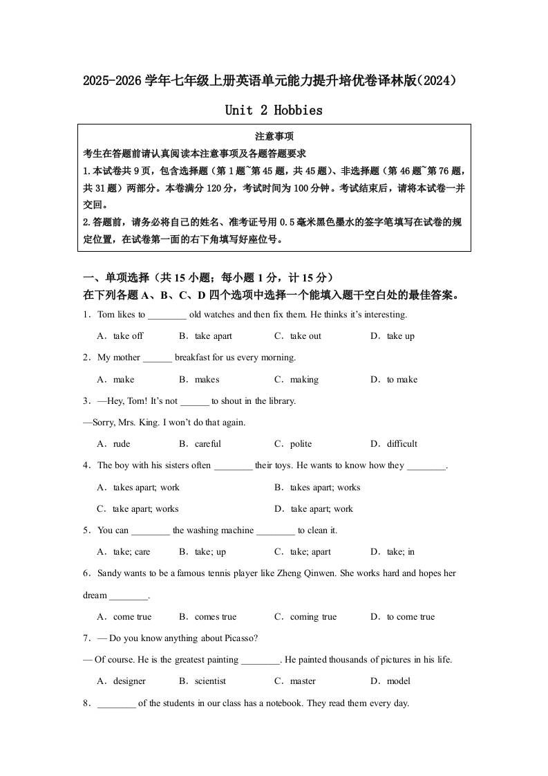 (单元培优卷)Unit 2 Hobbies 单元能力提升培优卷(含答案解析)-2025 - 2026学年七年级上册英语译林版