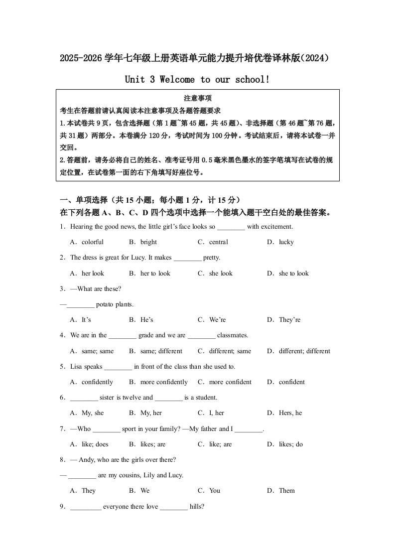 (单元培优卷)Unit 3 Welcome to our school! 单元能力提升培优卷(含答案解析)-2025 - 2026学年七年级上册英语译林版