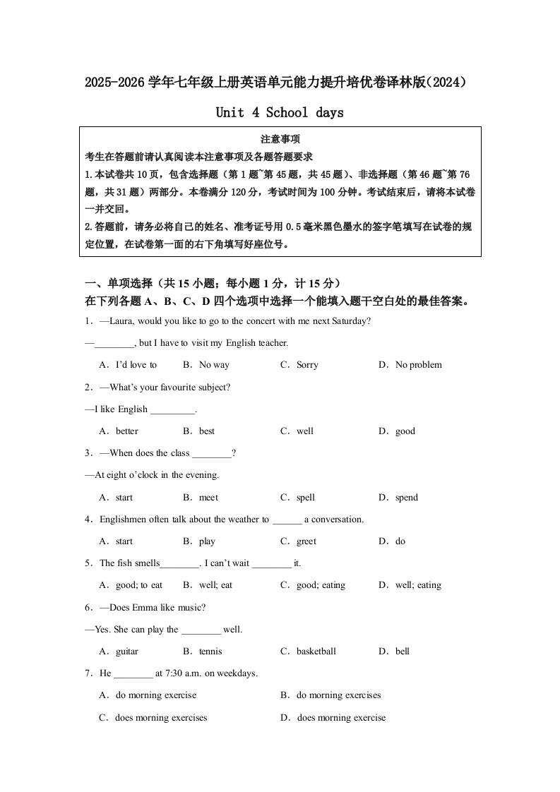 (单元培优卷)Unit 4 School days 单元能力提升培优卷(含答案解析)-2025 - 2026学年七年级上册英语译林版