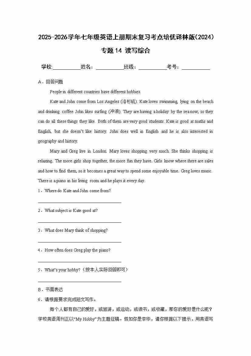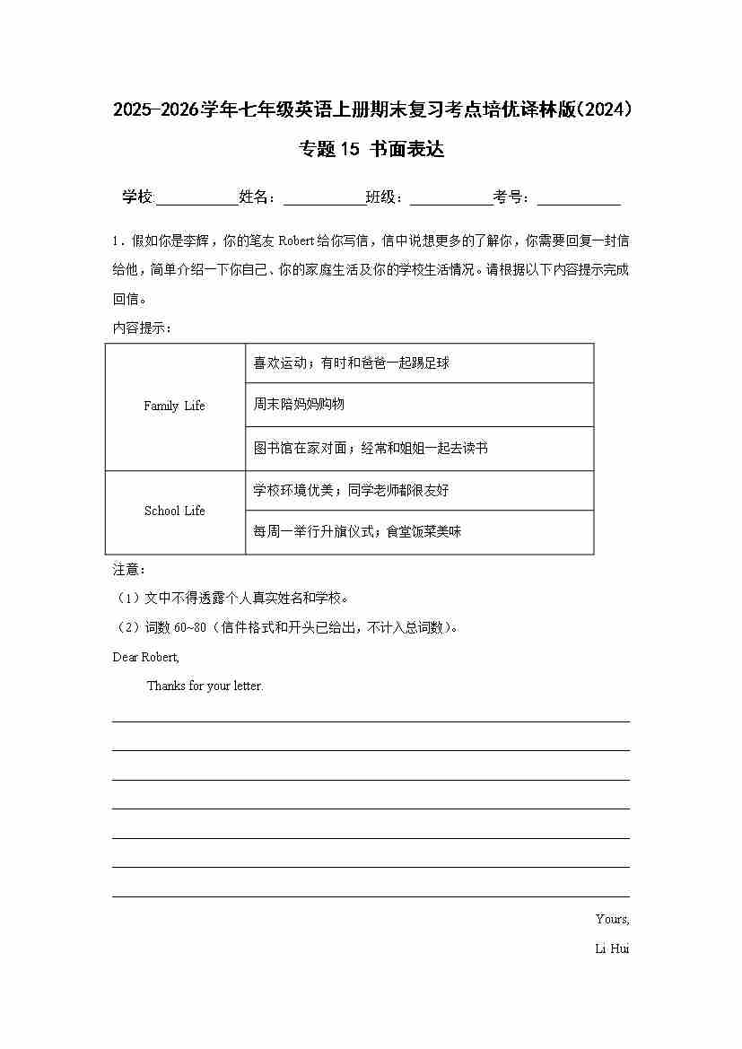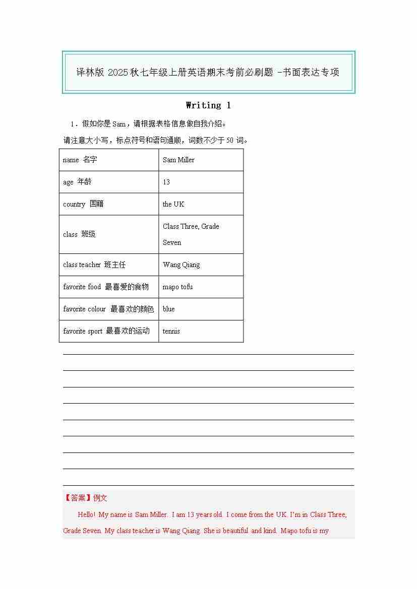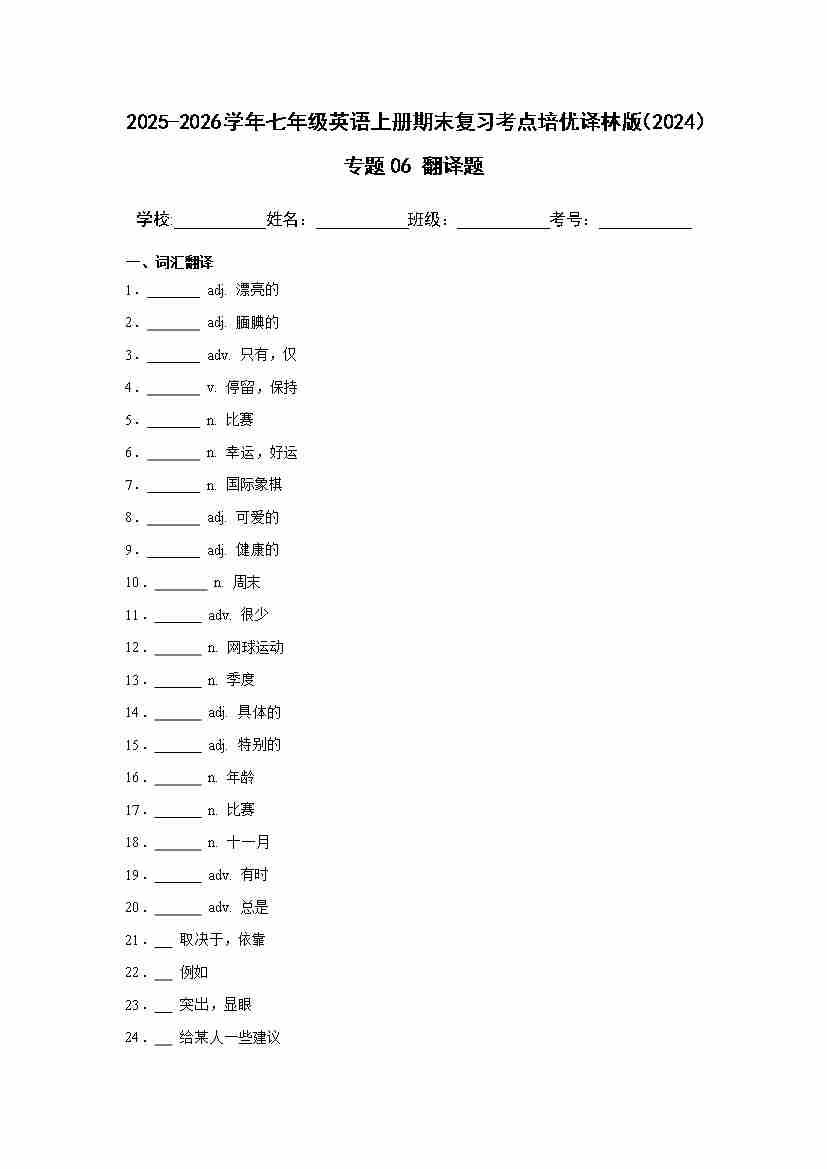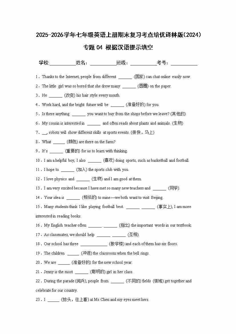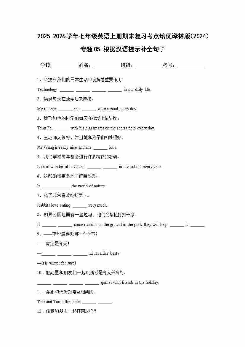 专题05 根据汉语提示补全句子 七上译林英语25秋