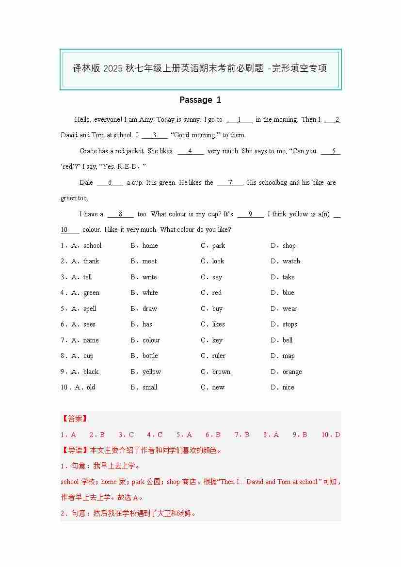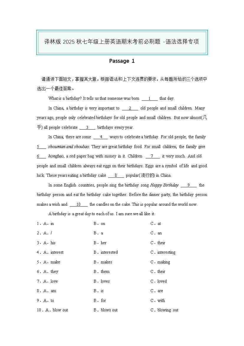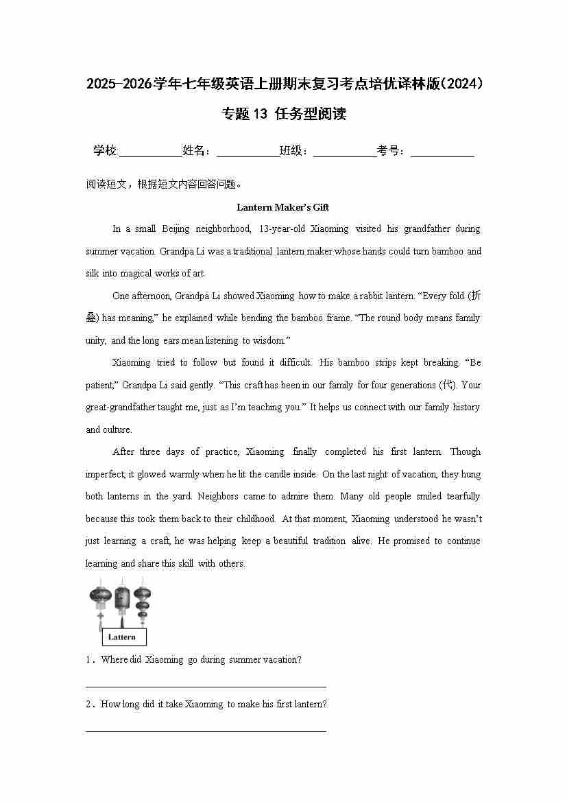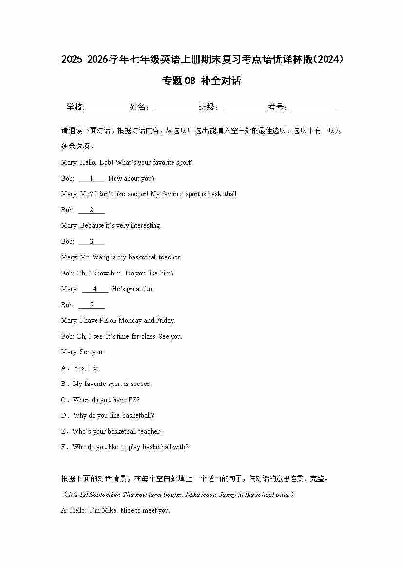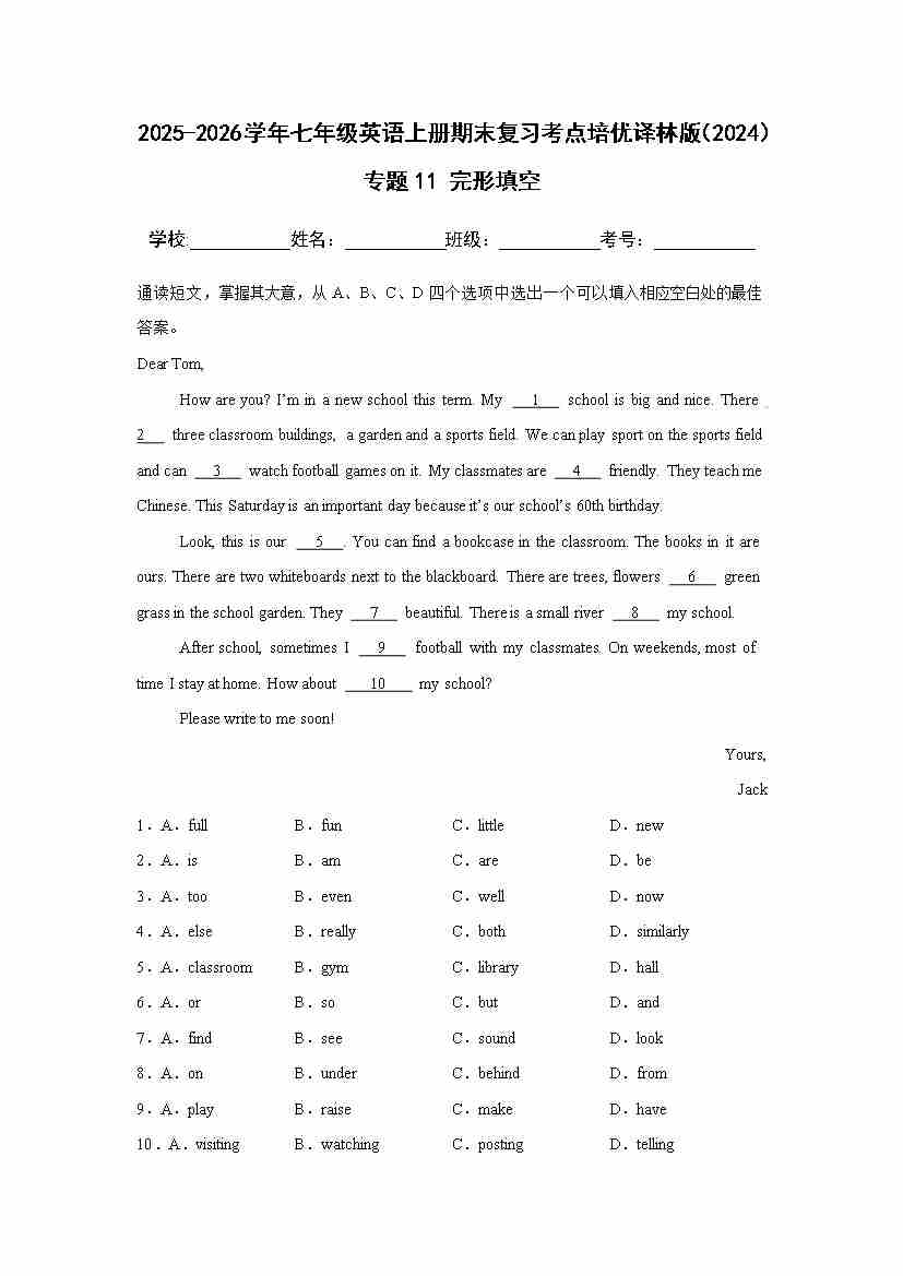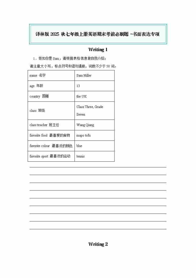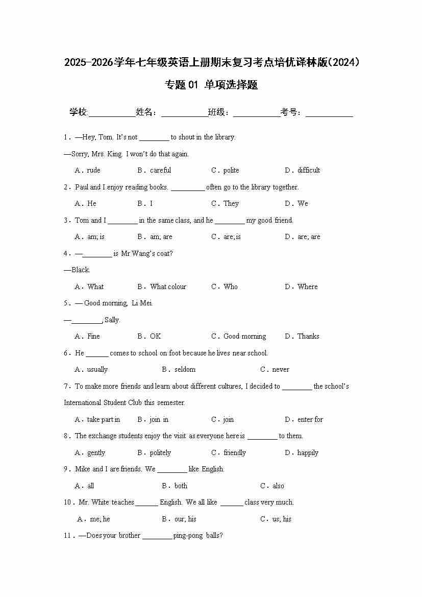专题05 根据汉语提示补全句子 七上译林英语25秋