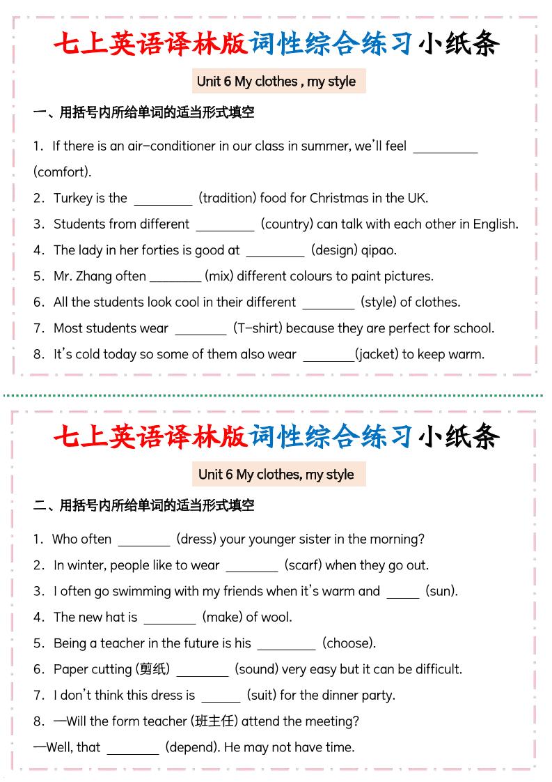 Unit 6 My clothes , my style七上英语译林版词性综合练习小纸条