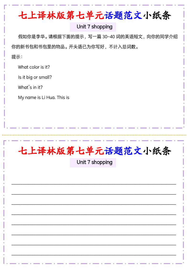七上英语译林版U7话题满分范文必背小纸条