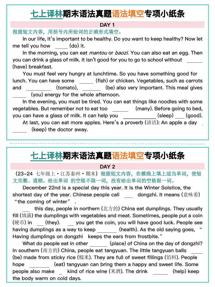 七上译林期末语法真题语法填空专项小纸条