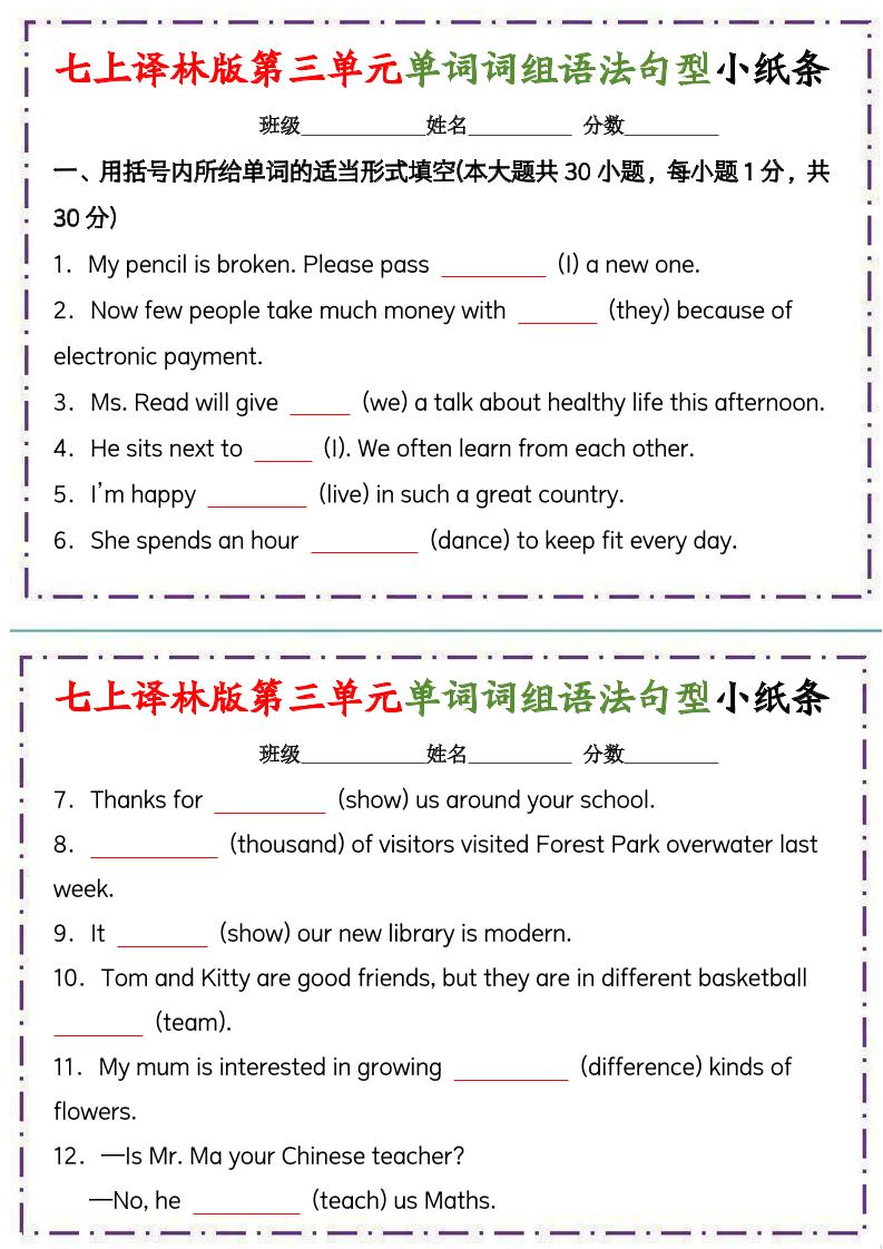 七年级上册英语(译林)语法小纸条【答案】