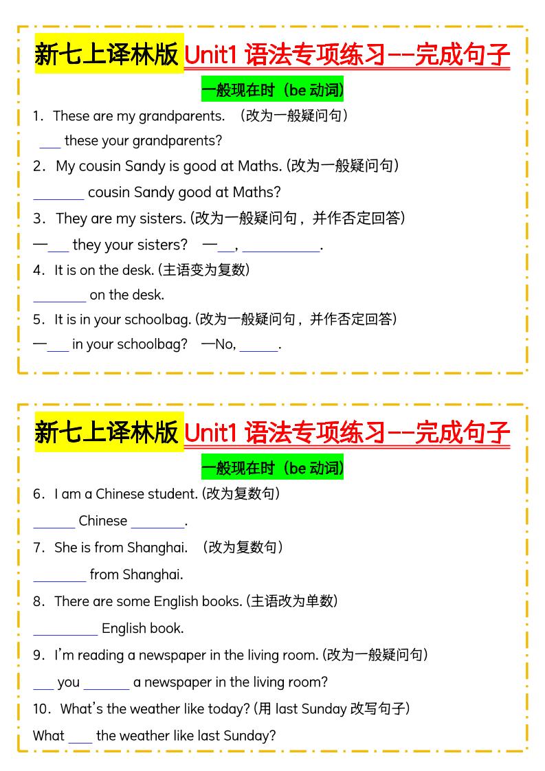 新七上译林版Unit1语法专项练习--完成句子