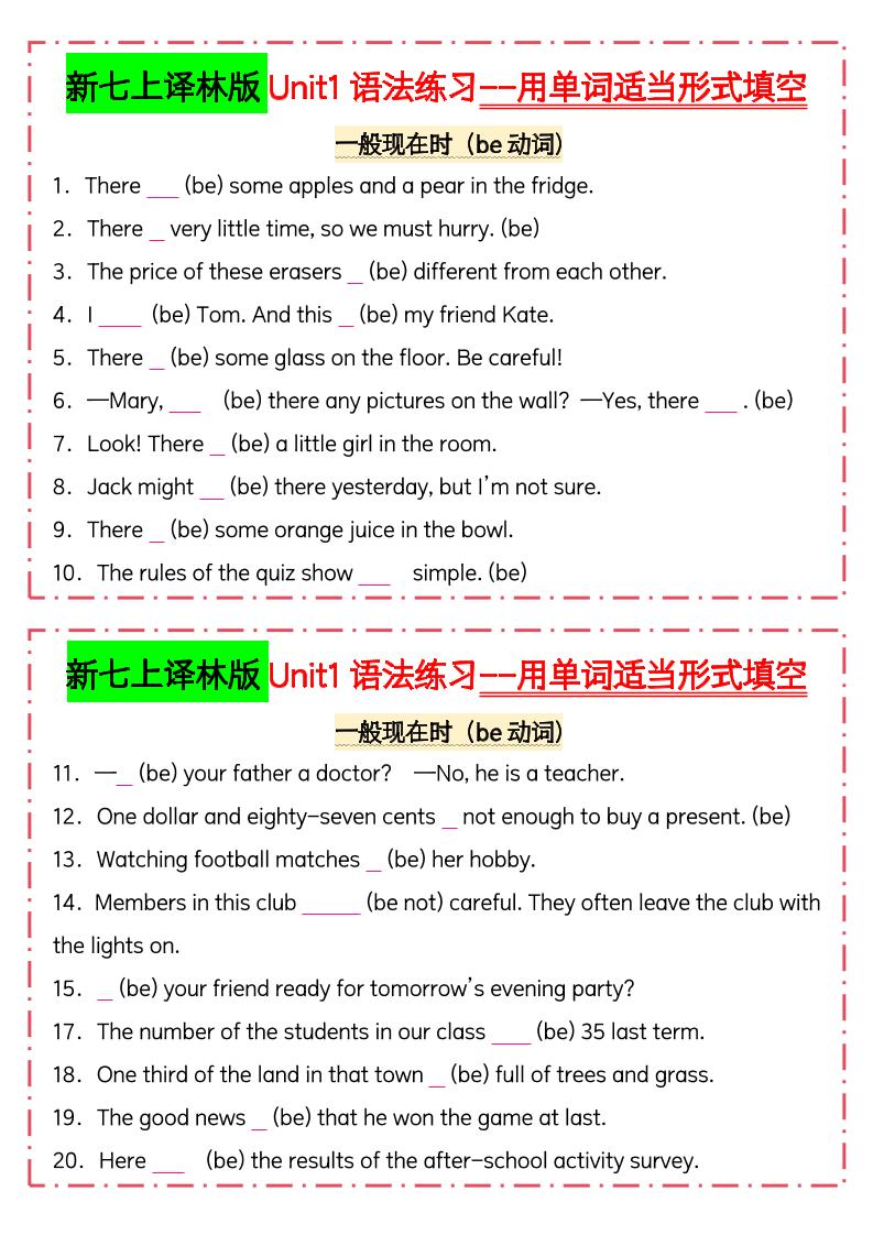 新七上译林版Unit1语法练习--用单词适当形式填空