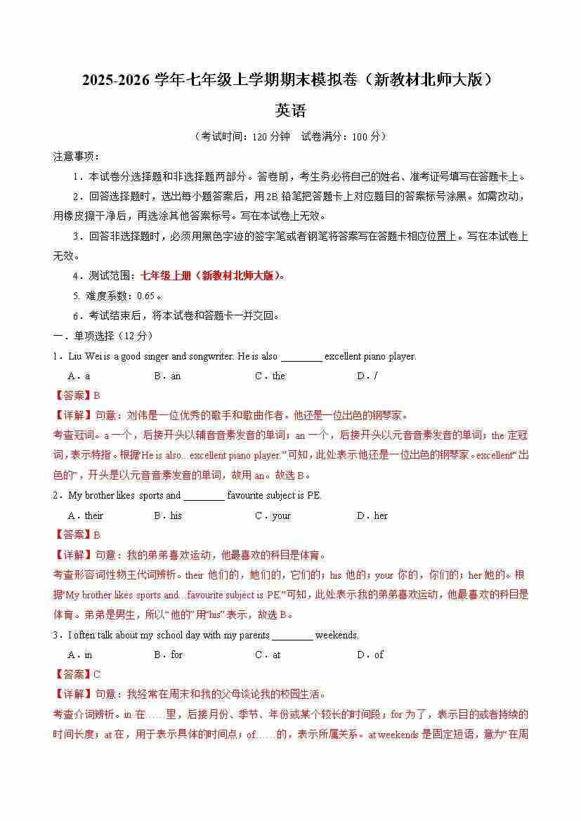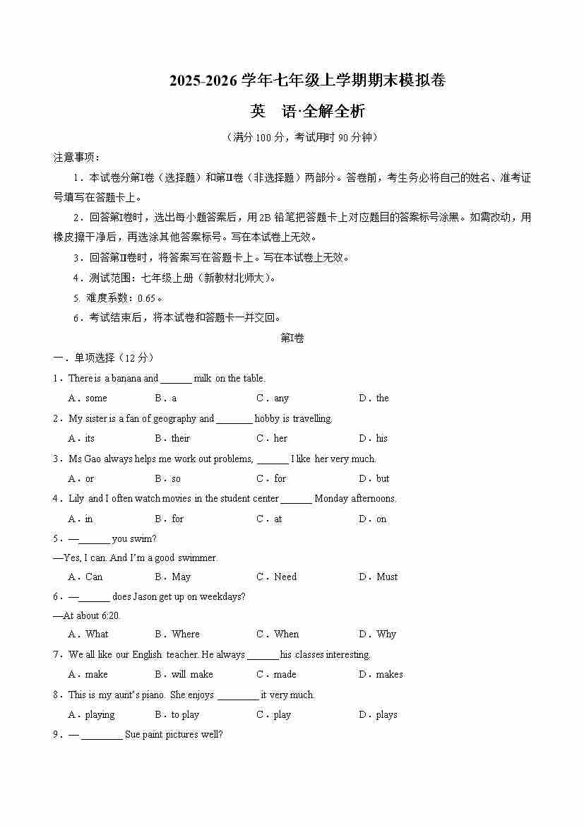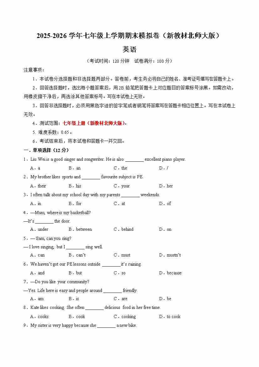 七年级英语期末模拟卷(考试版A4)【测试范围:七上全册】(新教材北师大版)