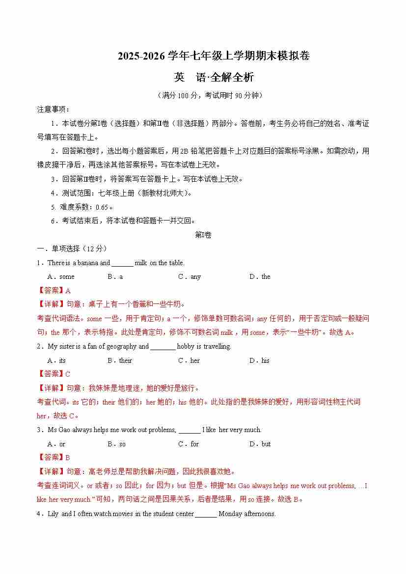 七年级英语期末模拟卷(全解全析)(新教材北师大版)