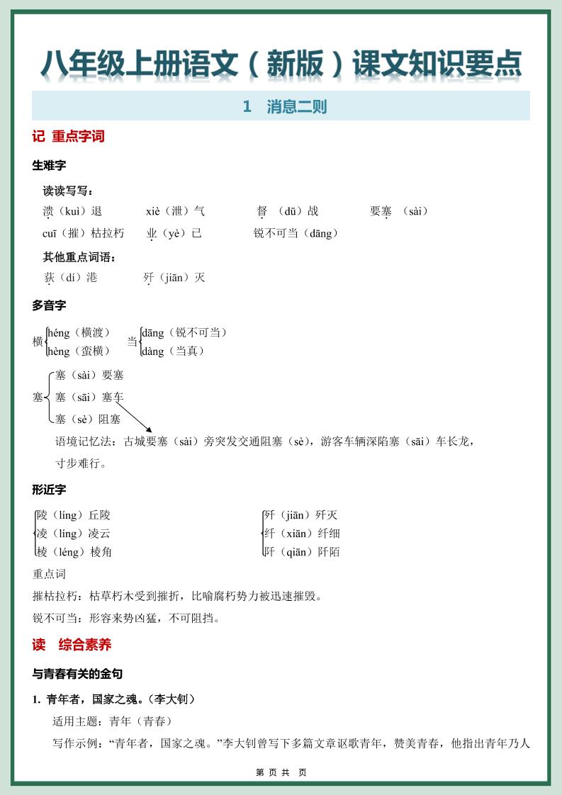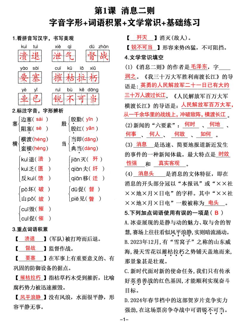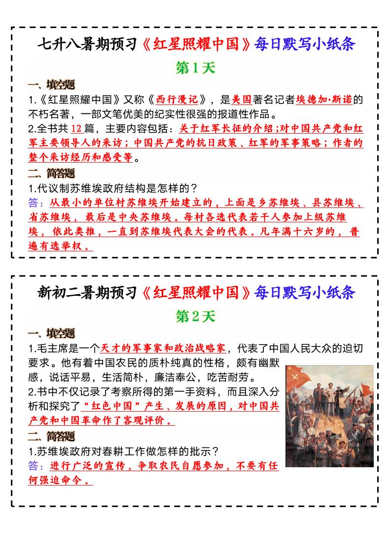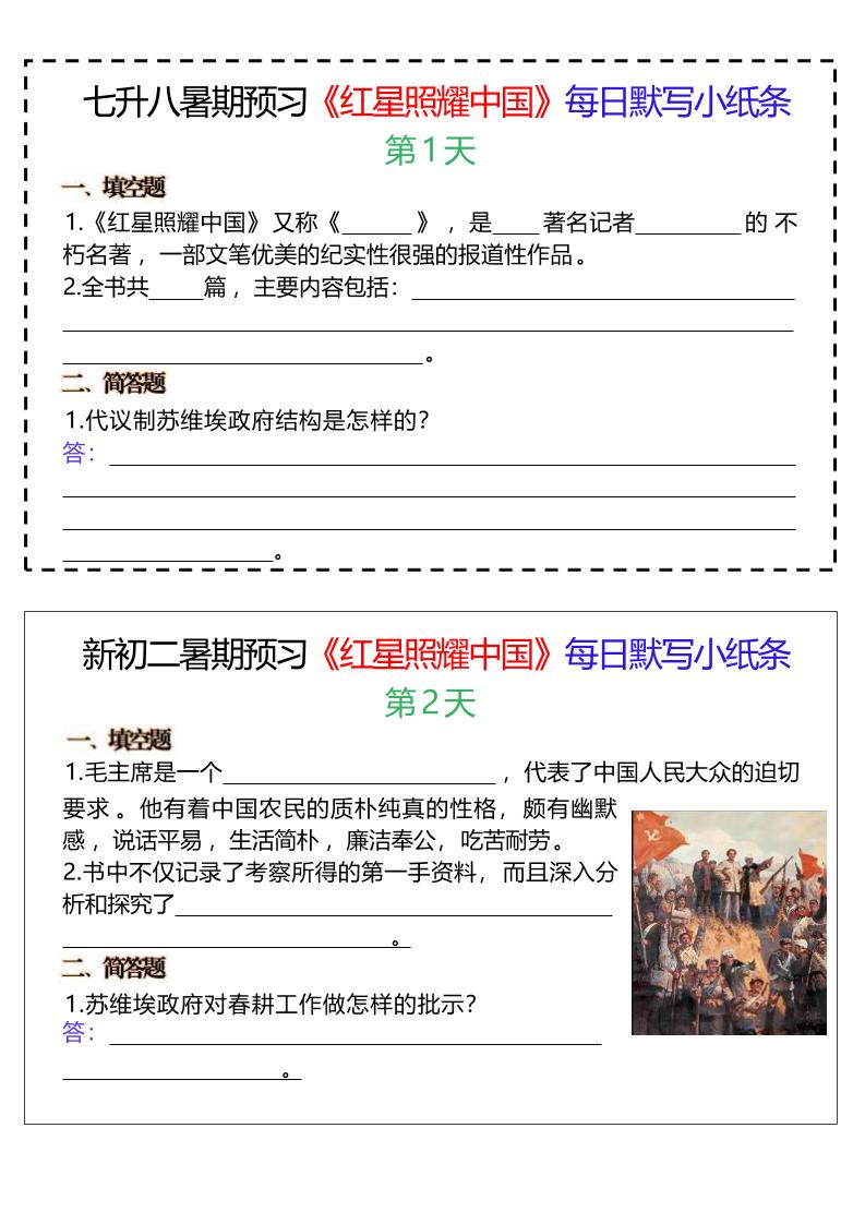 八上预习《红星照耀中国》每日默写小纸条(答案)