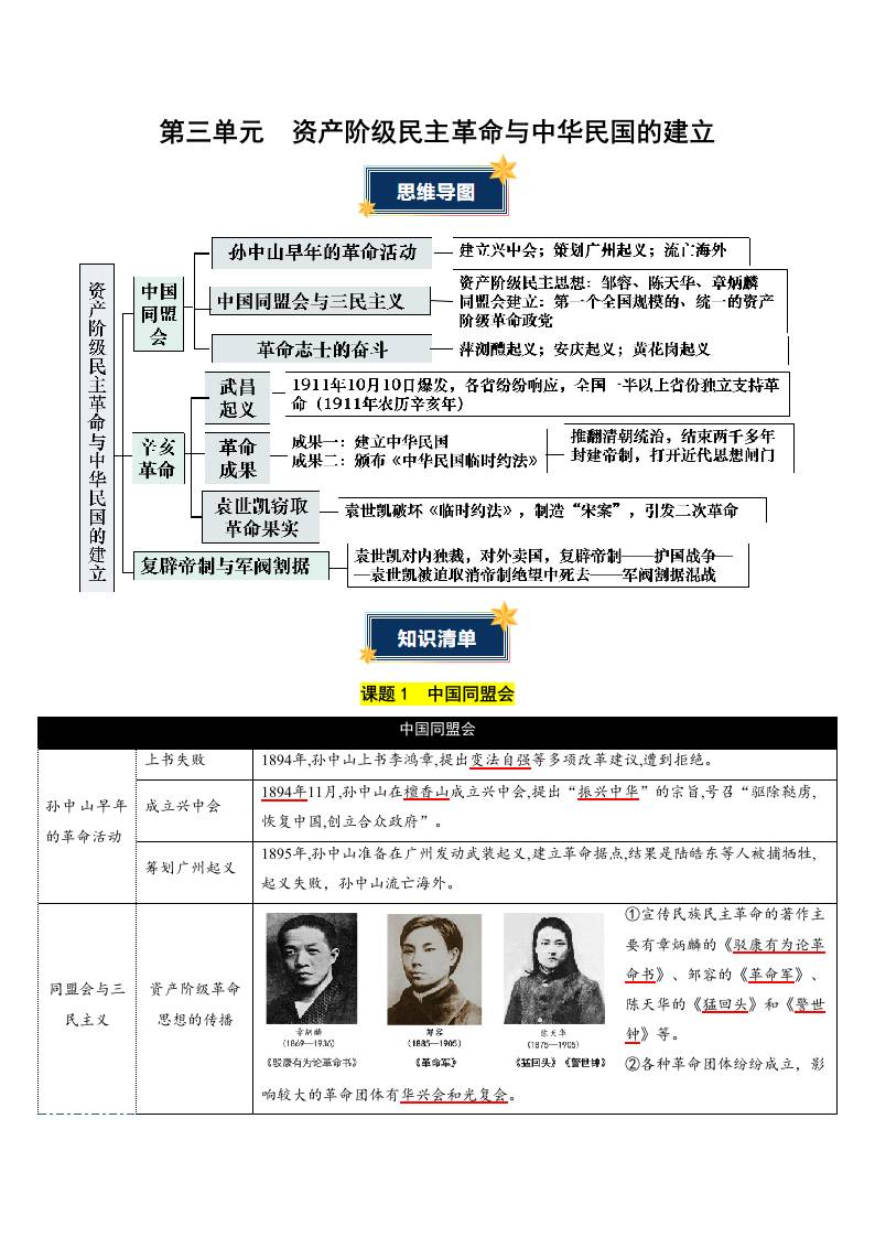 第三单元 资产阶级民主革命与中华民国的建立(知识清单)(答案版)
