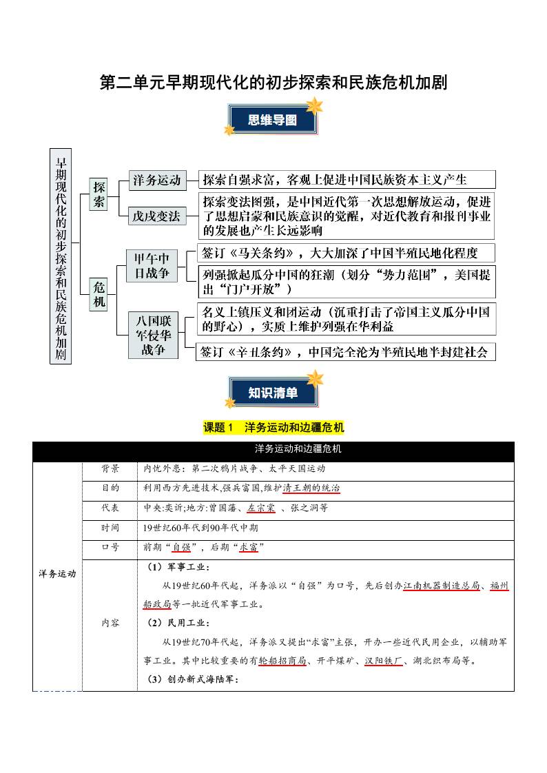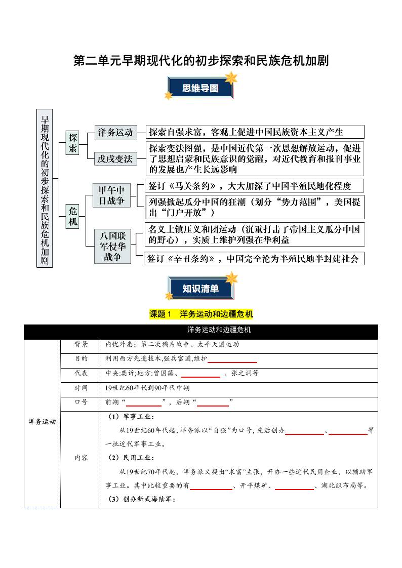 第二单元 早期现代化的初步探索和民族危机加剧(知识清单)(挖空版)