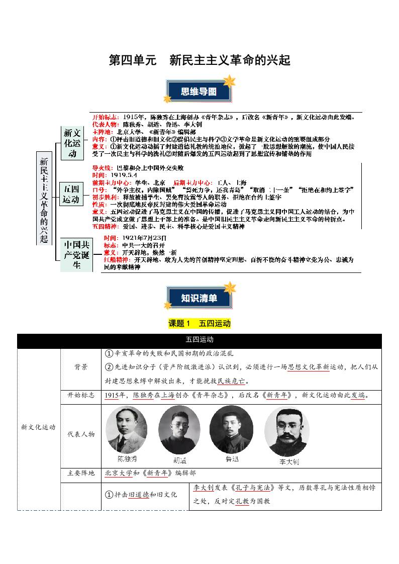 第四单元 新民主主义革命的兴起(知识清单)(答案版)