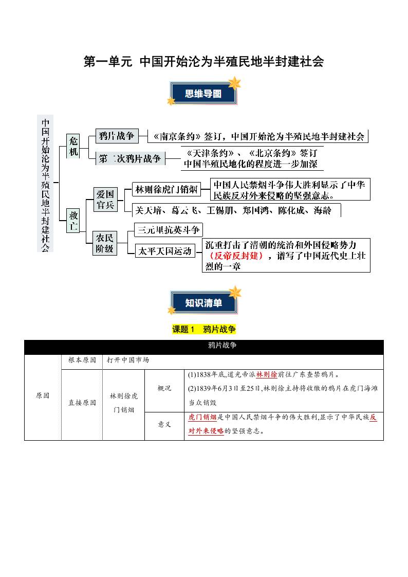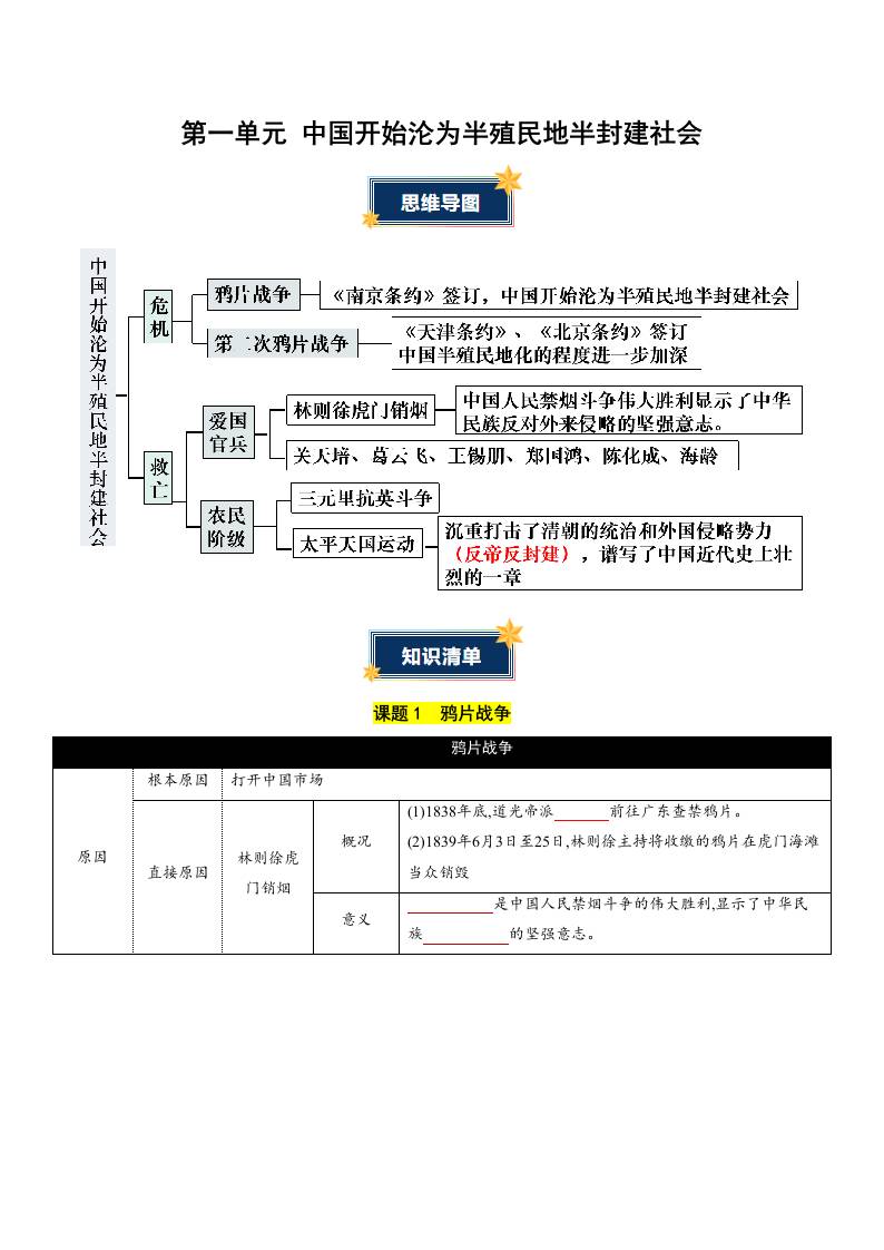 第一单元 中国开始沦为半殖民地半封建社会(知识清单)统编版(挖空版)