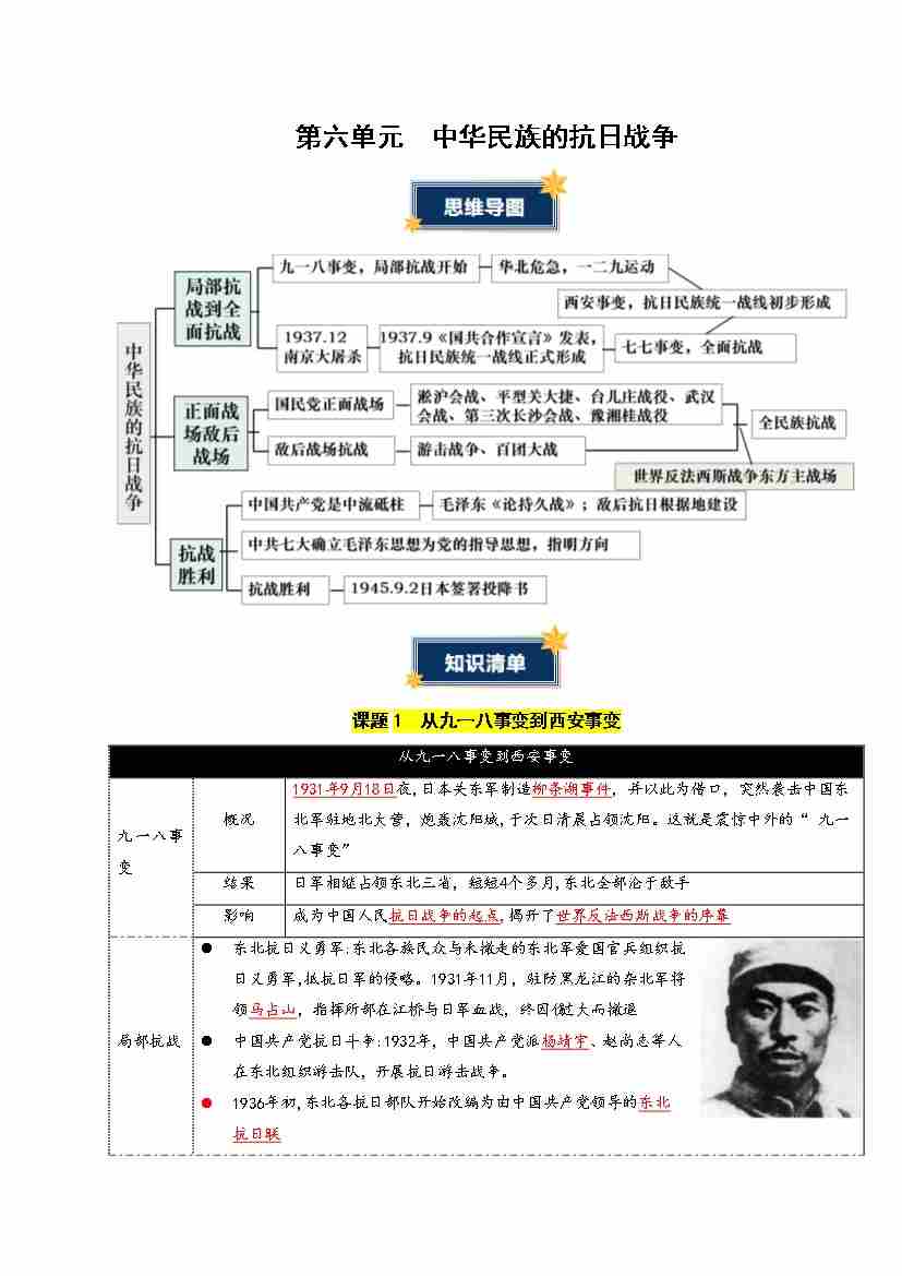 第六单元 中华民族的抗日战争(知识清单)(答案版)
