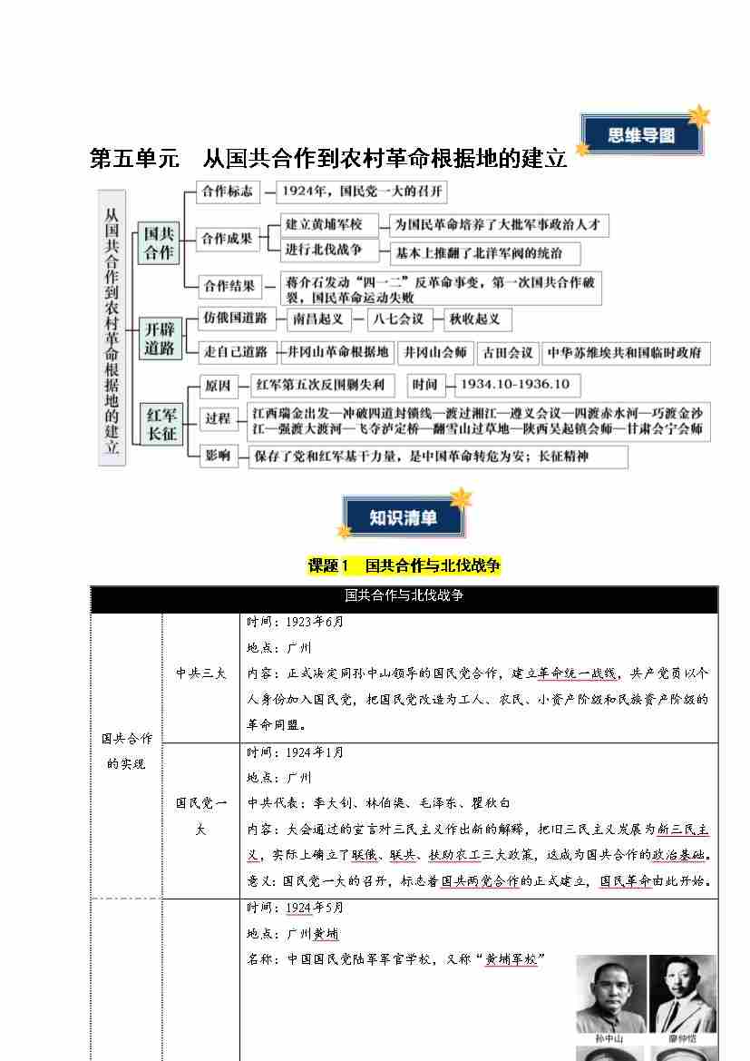 第五单元 从国共合作到农村革命根据地的建立(知识清单)(答案版)