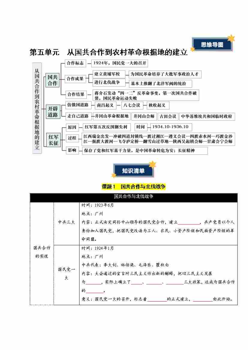 第五单元 从国共合作到农村革命根第五单元 (知识清单)(挖空版)