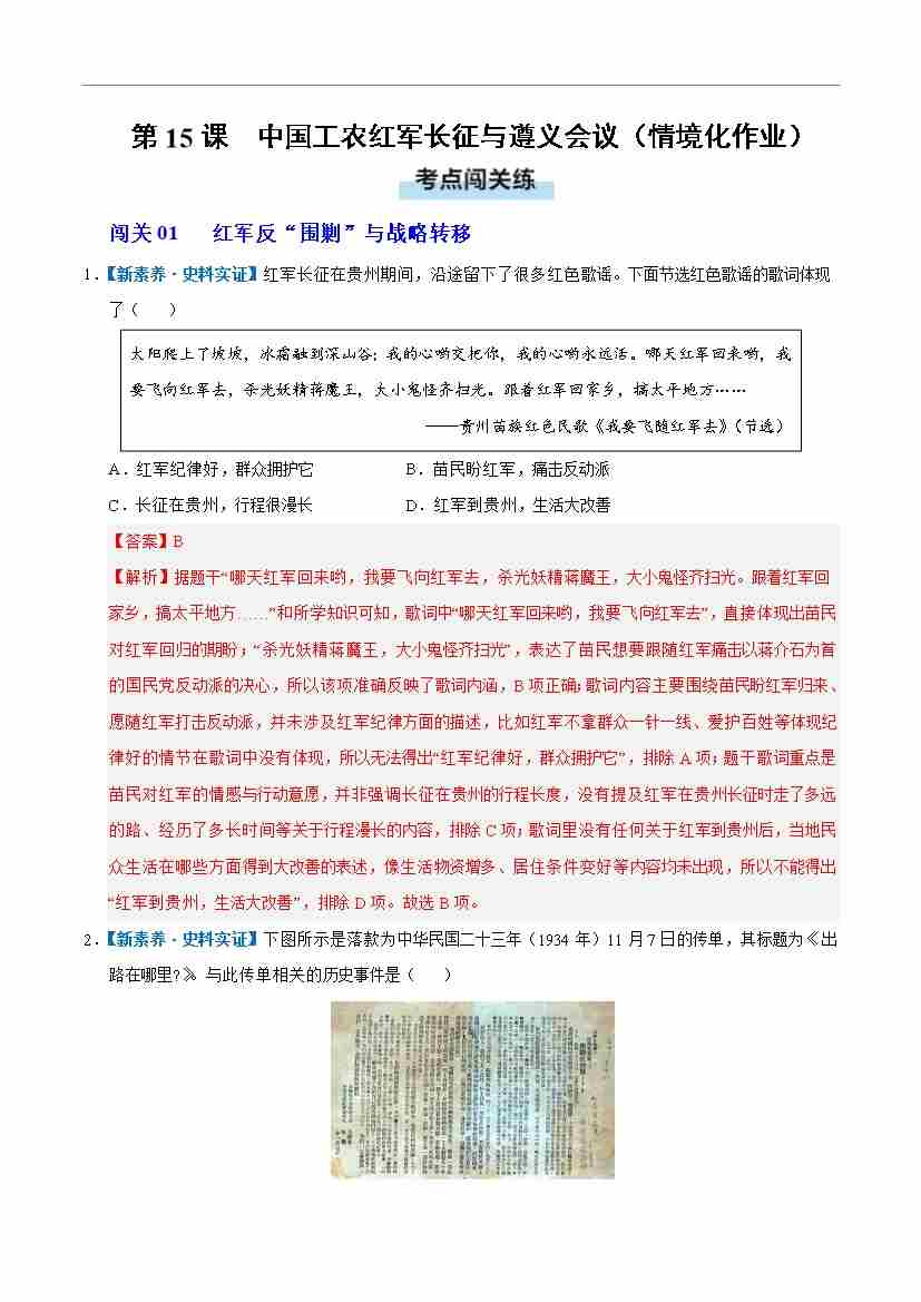 第15课 中国工农红军长征与遵义会议(情境化作业)(解析版)