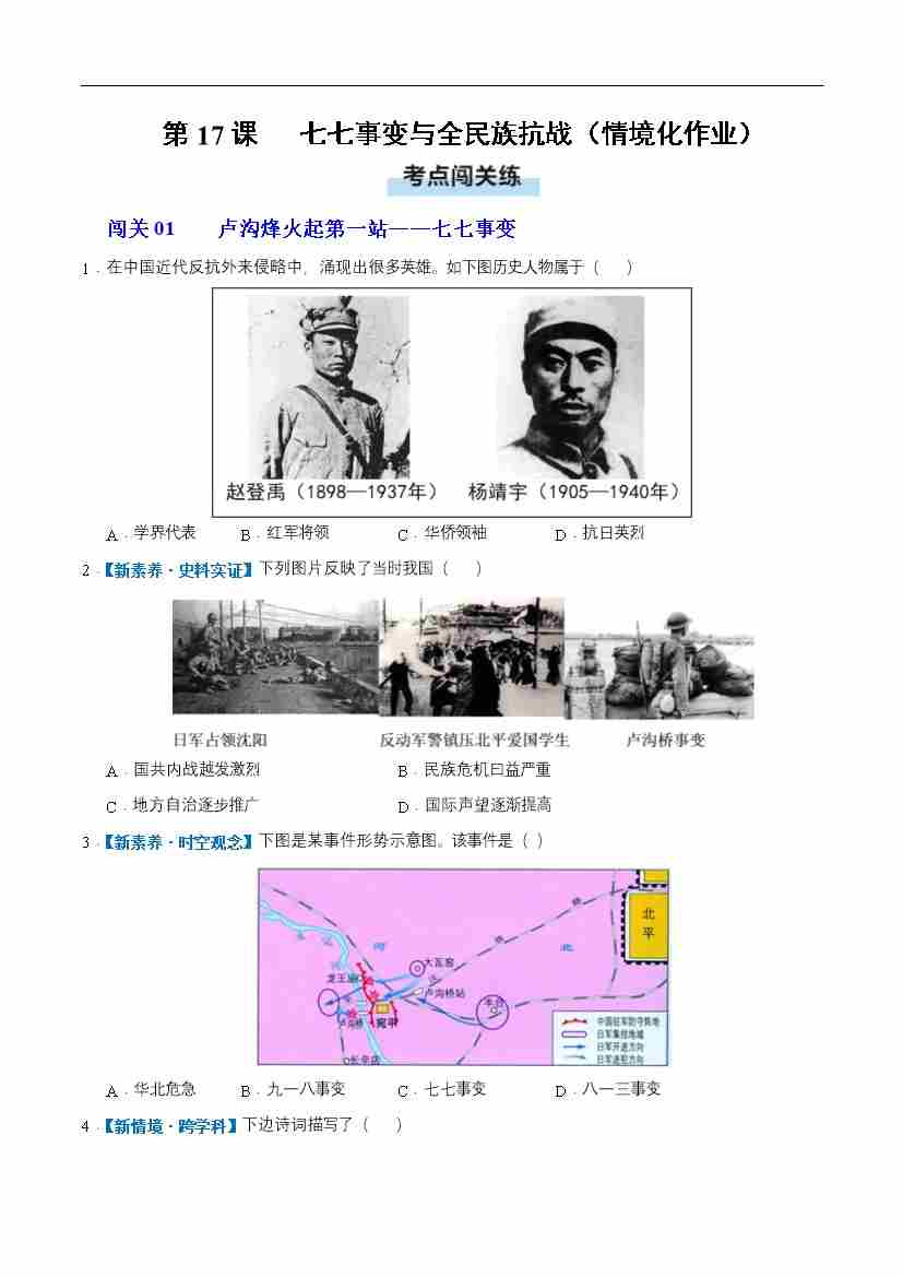 第17课 七七事变与全民族抗战(情境化作业)(原卷版)