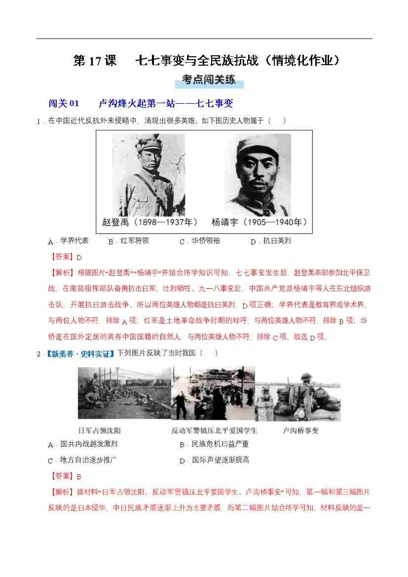 第17课 七七事变与全民族抗战(情境化作业)(解析版)