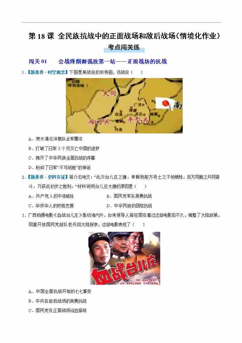 第18课 全民族抗战中的正面战场和敌后战场(情境化作业)(原卷版)