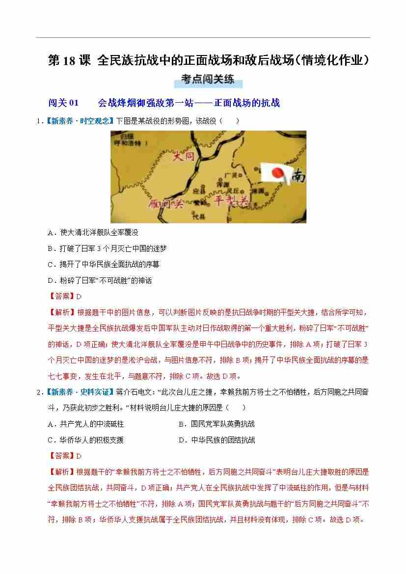 第18课 全民族抗战中的正面战场和敌后战场(情境化作业)(解析版)