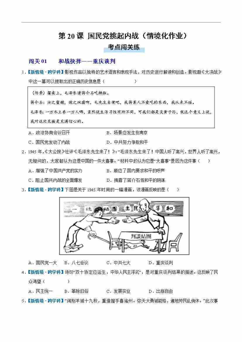 第20课 国民党挑起内战(情境化作业)(原卷版)