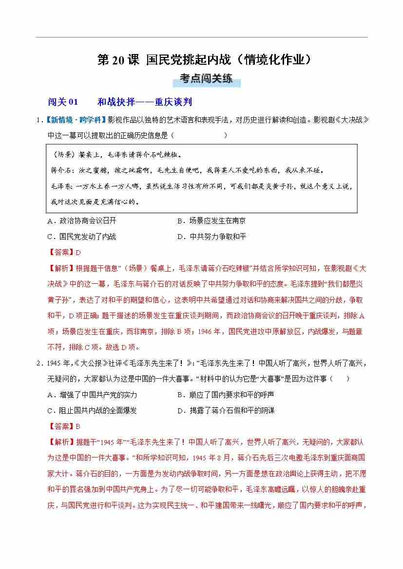 第20课 国民党挑起内战(情境化作业)(解析版)