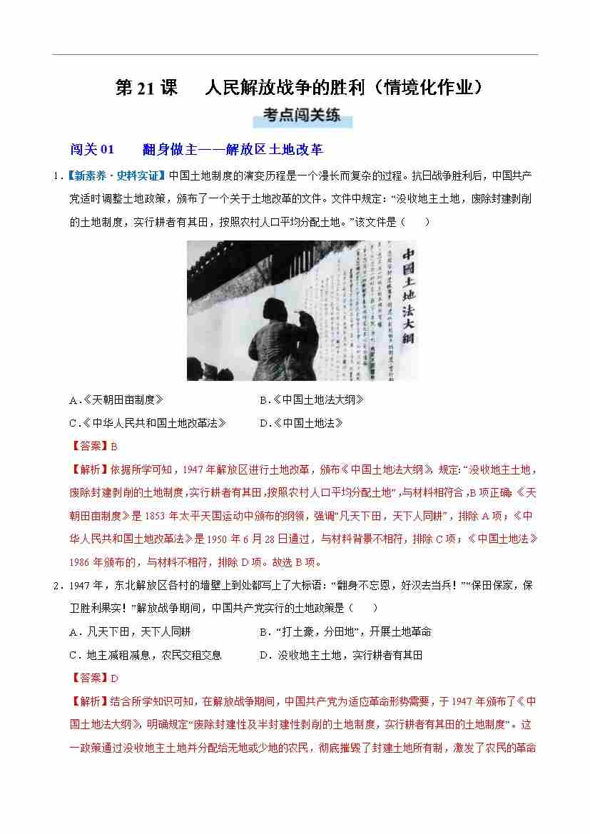 第21课 人民解放战争的胜利(情境化作业)(解析版)