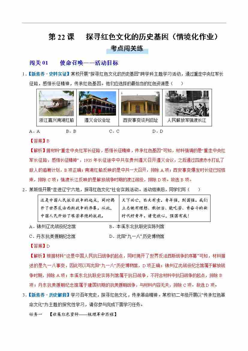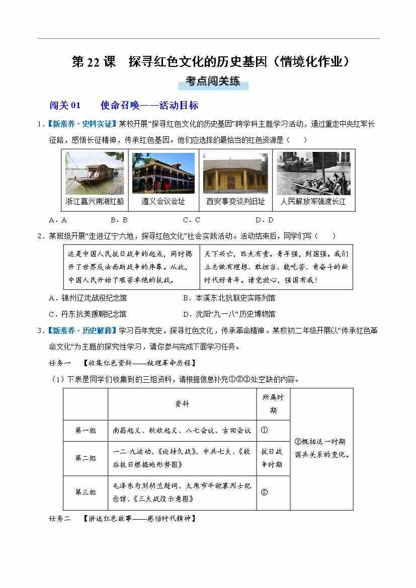 第22课 活动课 探寻红色文化的历史基因(情境化作业)(解析版)