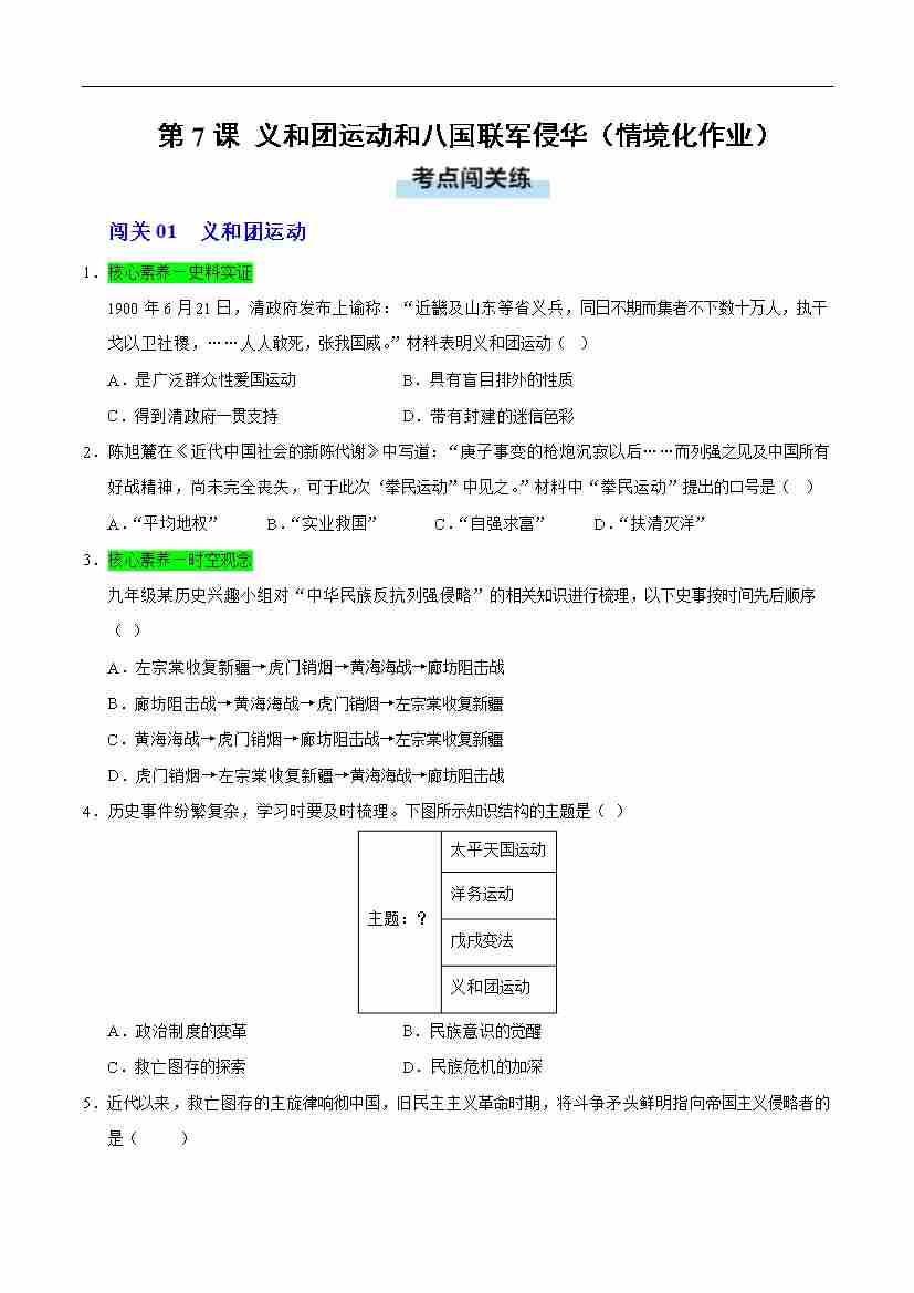第7课 义和团运动和八国联军侵华(情境化作业)(原卷版)