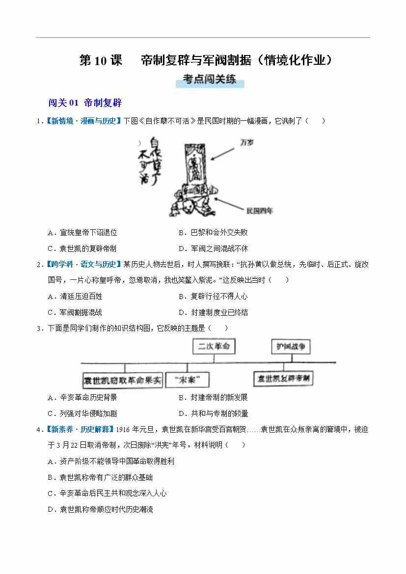 第10课 帝制复辟与军阀割据(情境化作业)(原卷版)