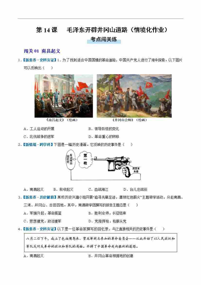 第14课 毛泽东开辟井冈山道路(情境化作业)(原卷版)