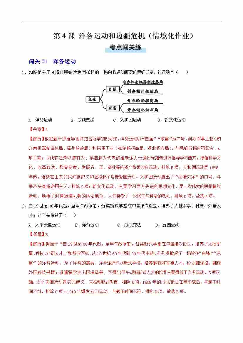 第4课 洋务运动和边疆危机(情境化作业)(解析版)