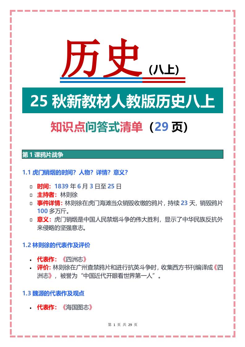 25秋新教材人教版历史八上知识点问答式清单