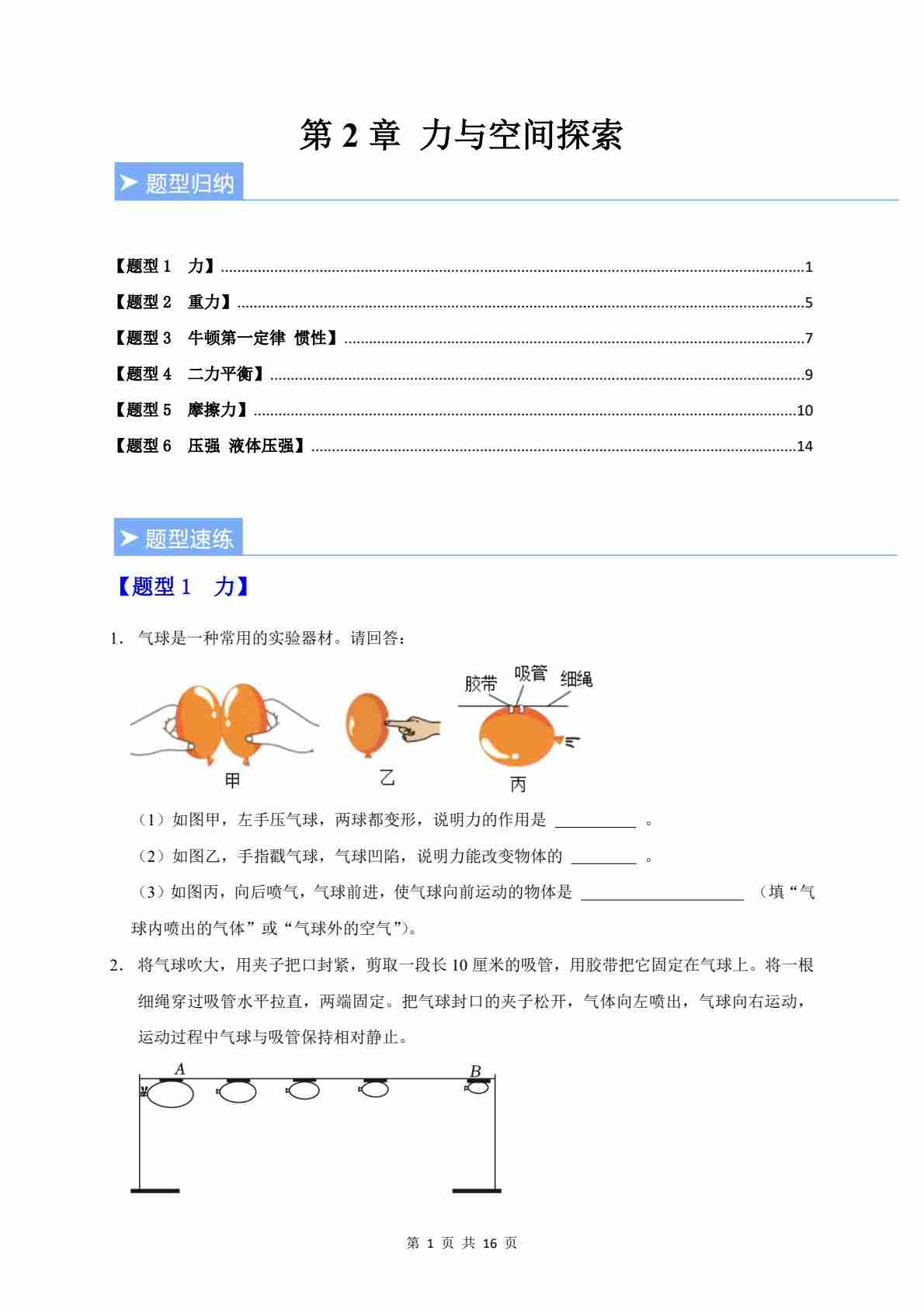 第3节 压强 第4节 空间探索(重难点训练)(原卷版)