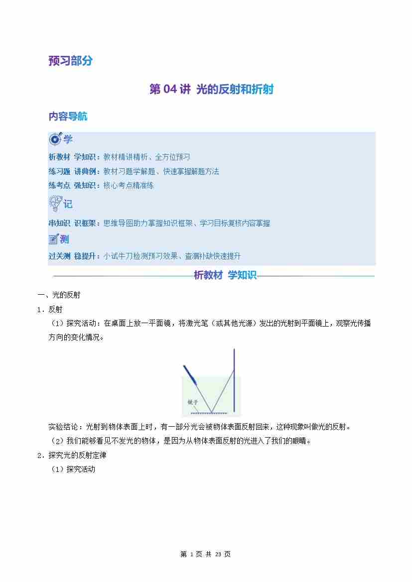 第04讲:光的反射和折射(预习)(原卷版)
