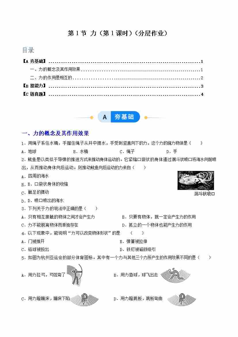 第1节 力 第1课时(分层作业)(原卷版)科学浙教版2024八年级上册