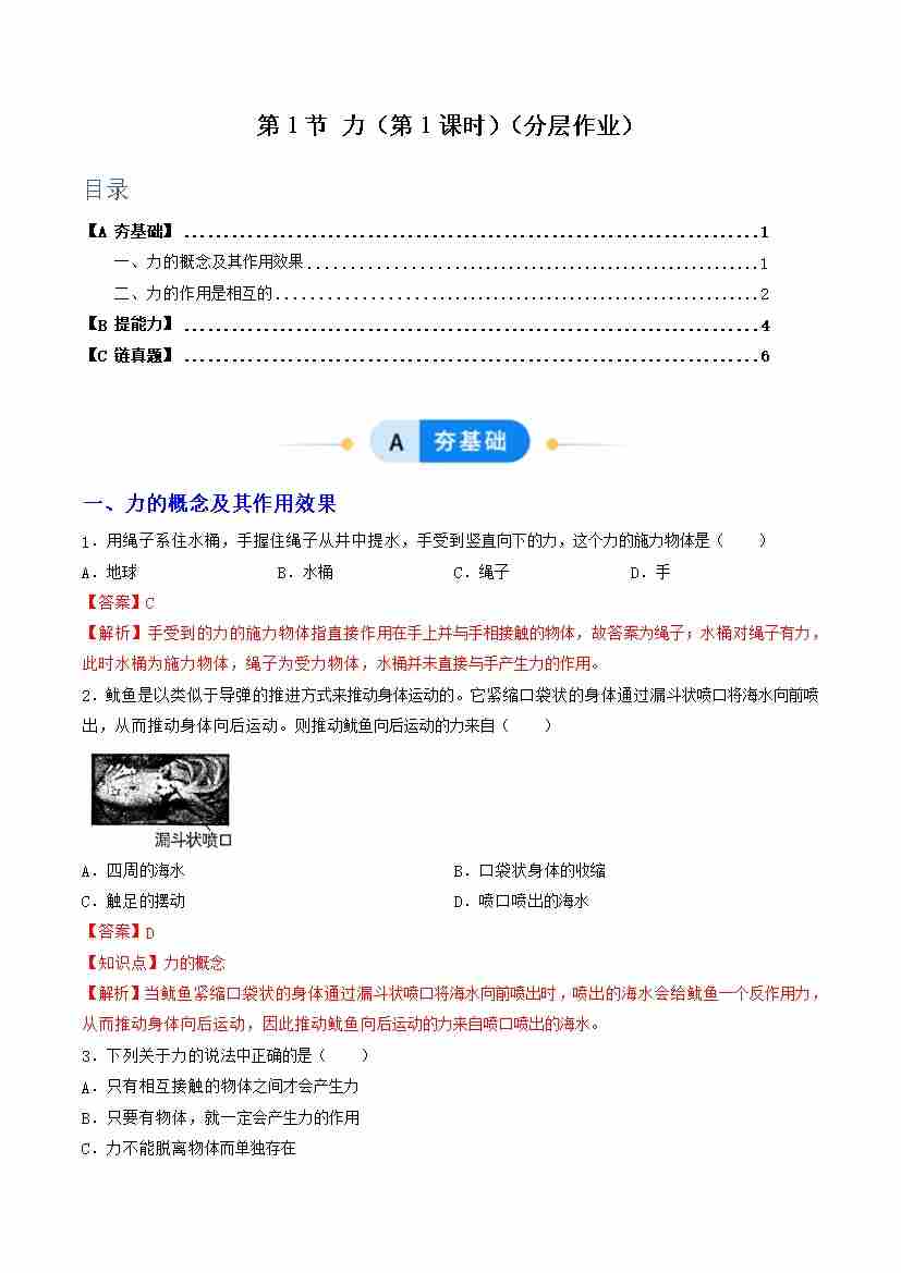 第1节 力 第1课时(分层作业)(解析版)科学浙教版2024八年级上册
