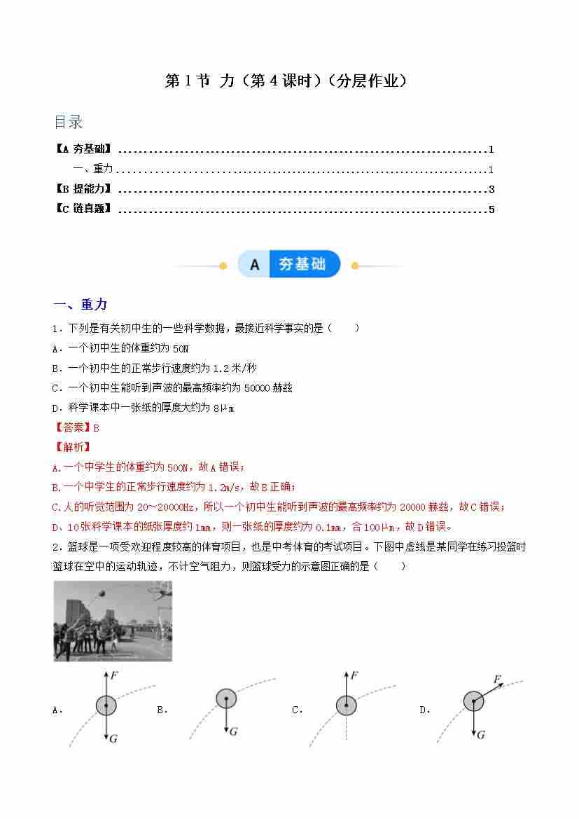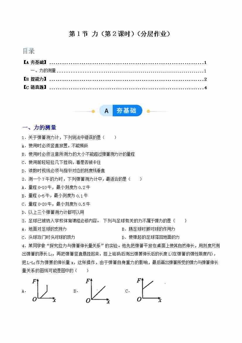 第1节 力 第2课时(分层作业)(原卷版)科学浙教版2024八年级上册
