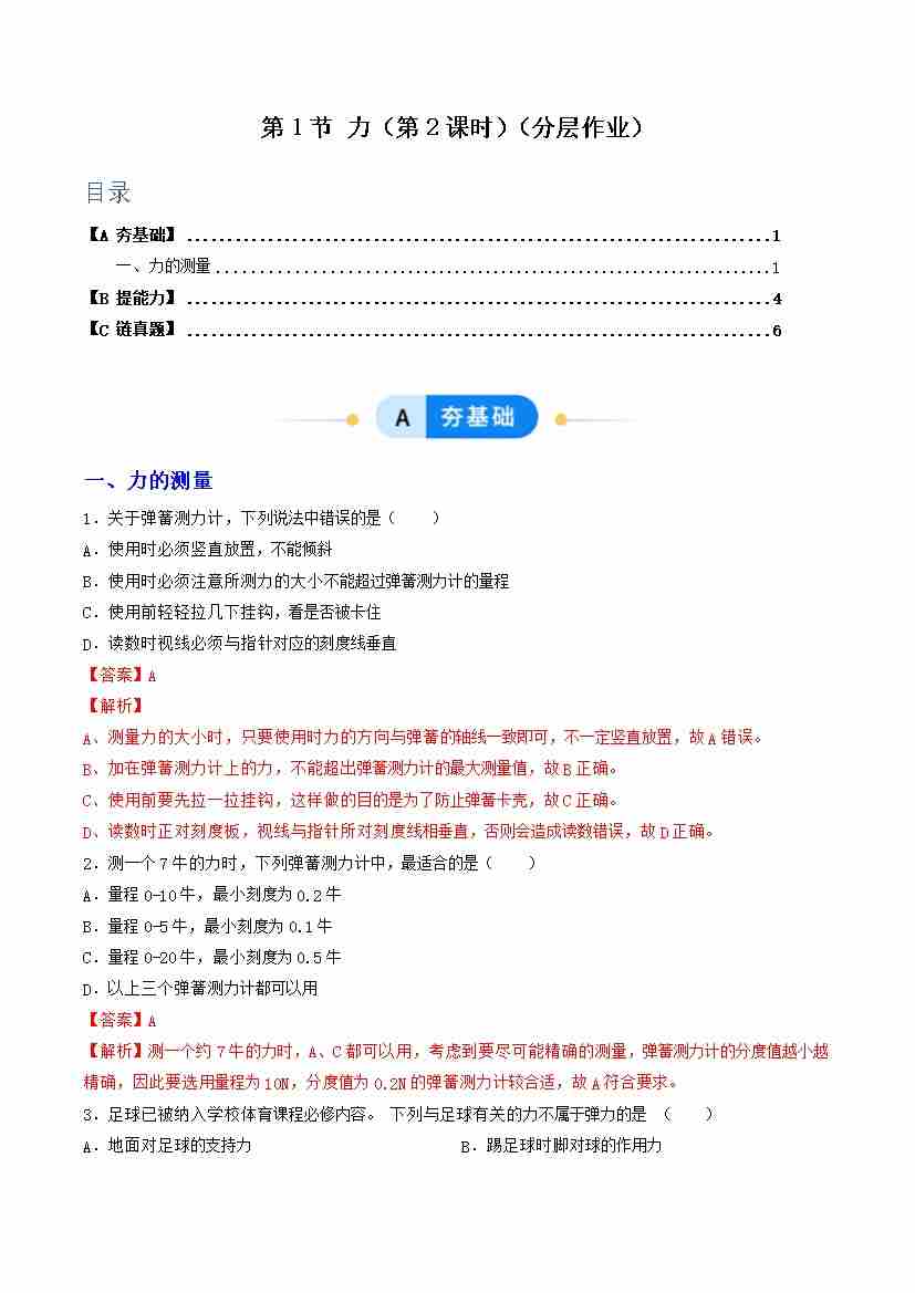 第1节 力 第2课时(分层作业)(解析版)科学浙教版2024八年级上册