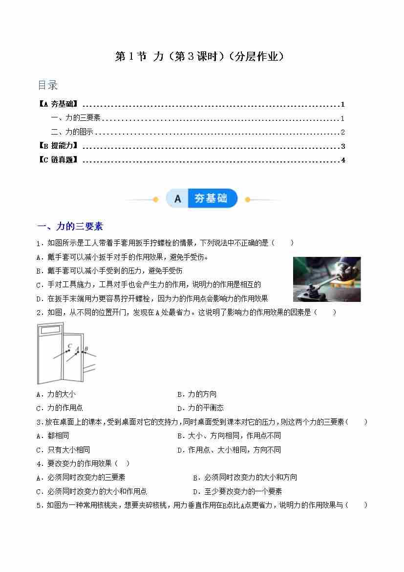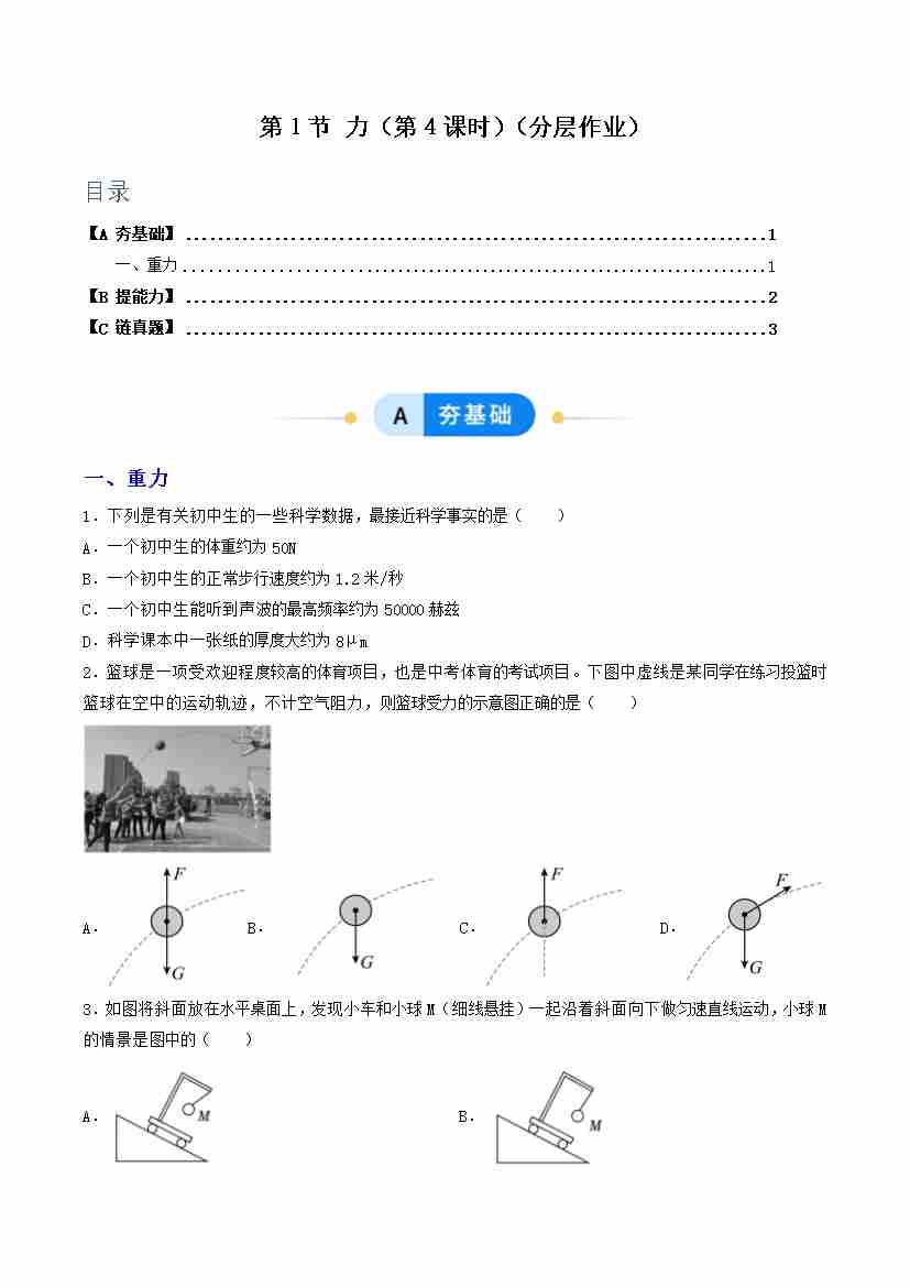 第1节 力 第4课时(分层作业)(原卷版)科学浙教版2024八年级上册