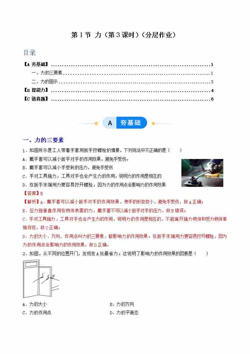 第1节 力 第3课时(分层作业)(解析版)科学浙教版2024八年级上册