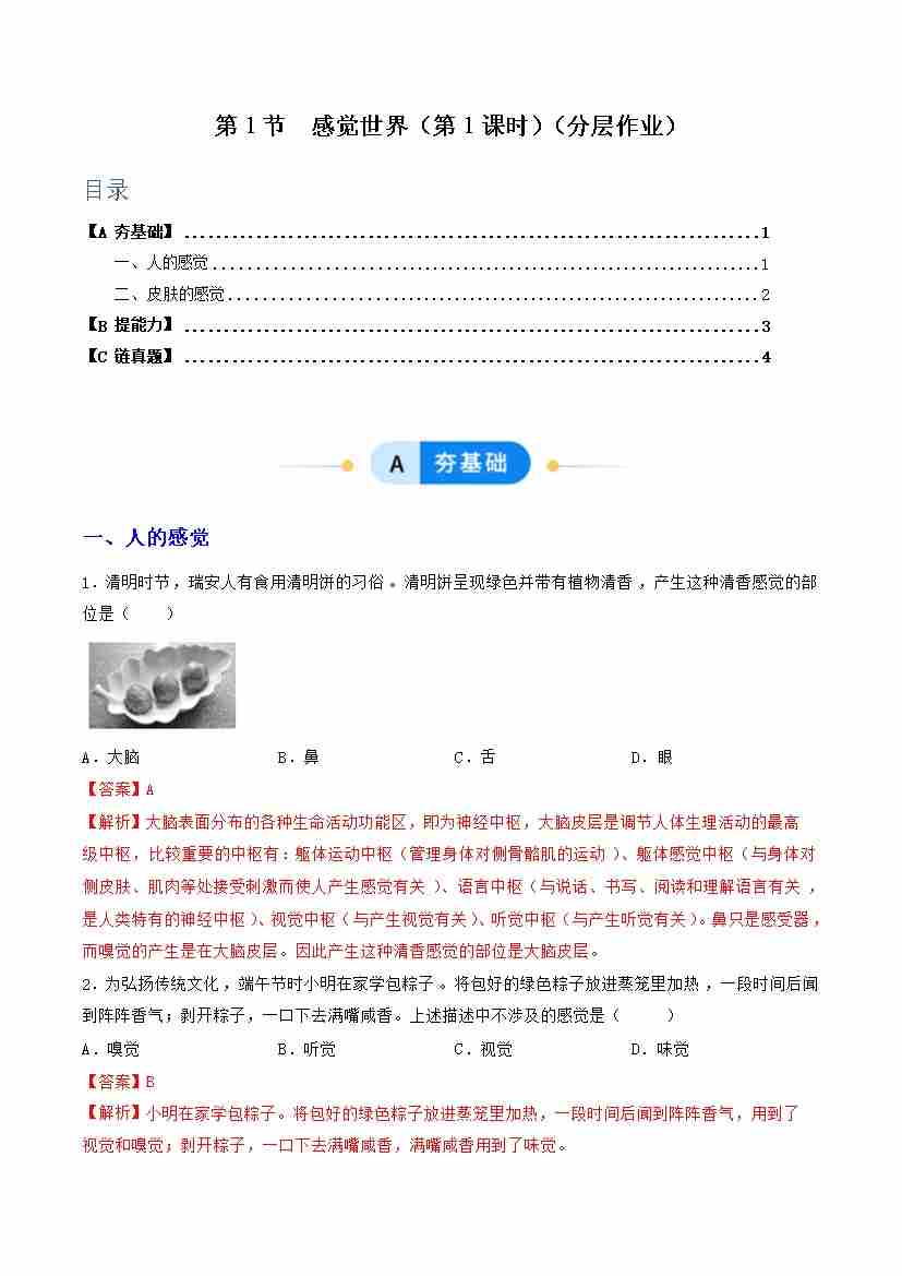 第1节 感觉世界 第1课时(分层作业)(解析版)科学浙教版2024八年级上册