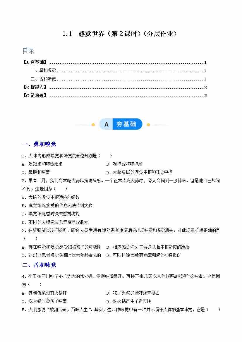 第1节 感觉世界 第1课时(分层作业)(原卷版)科学浙教版2024八年级上册