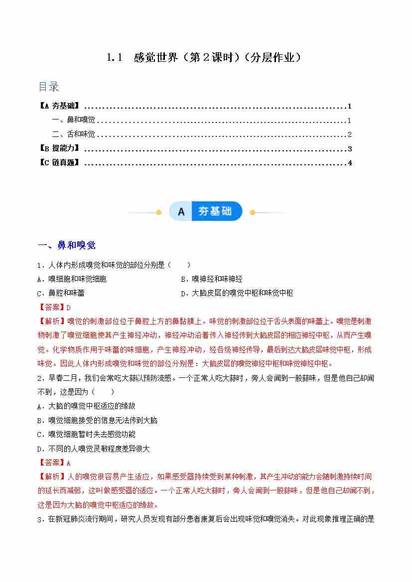 第1节 感觉世界 第2课时(分层作业)(解析版)科学浙教版2024八年级上册
